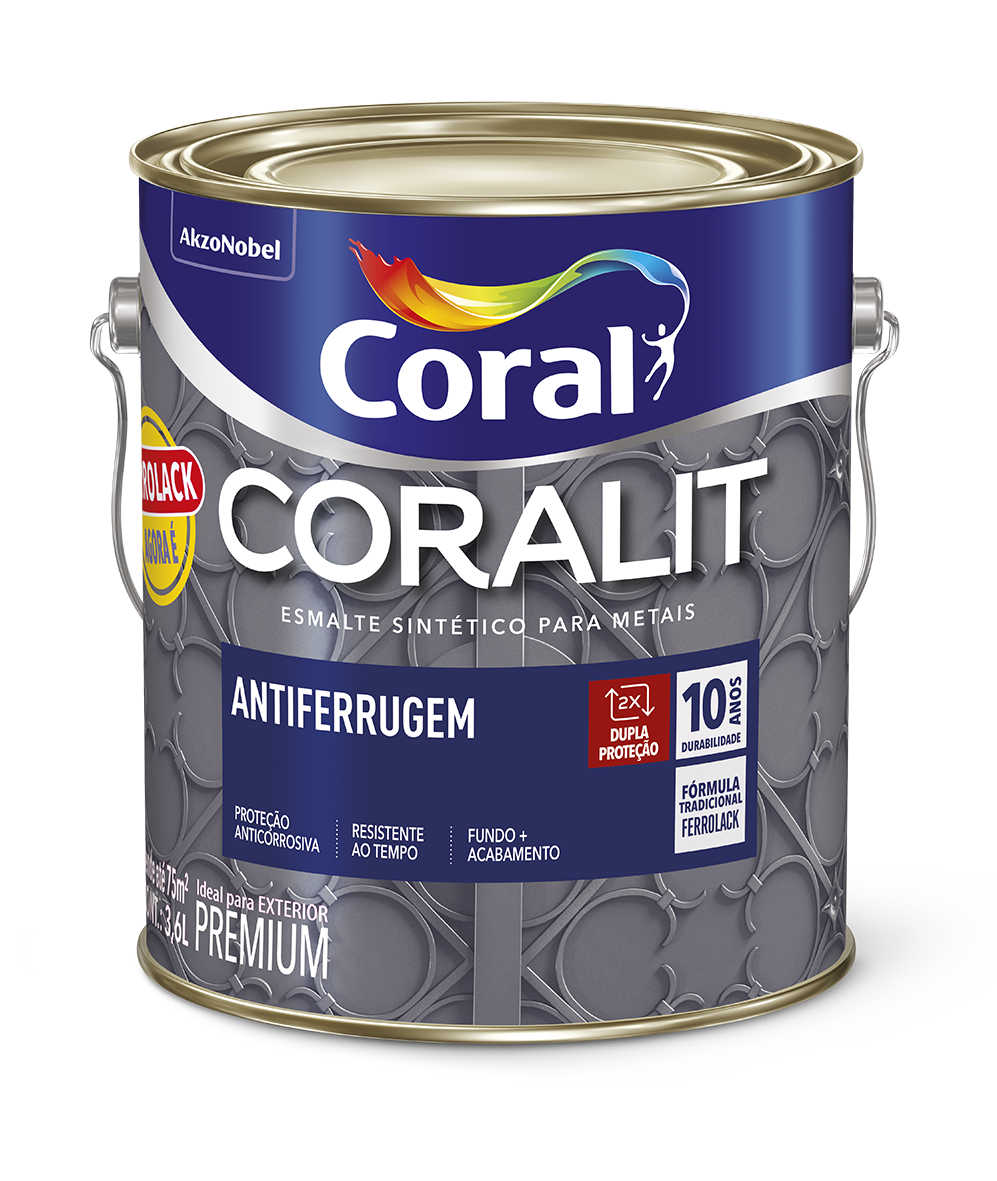 Coralit Antiferrugem é um esmalte sintético que oferece excelente proteção anticorrosiva e contra os efeitos do sol e da chuva, graças à sua tecnologia fundo + acabamento em um só produto.