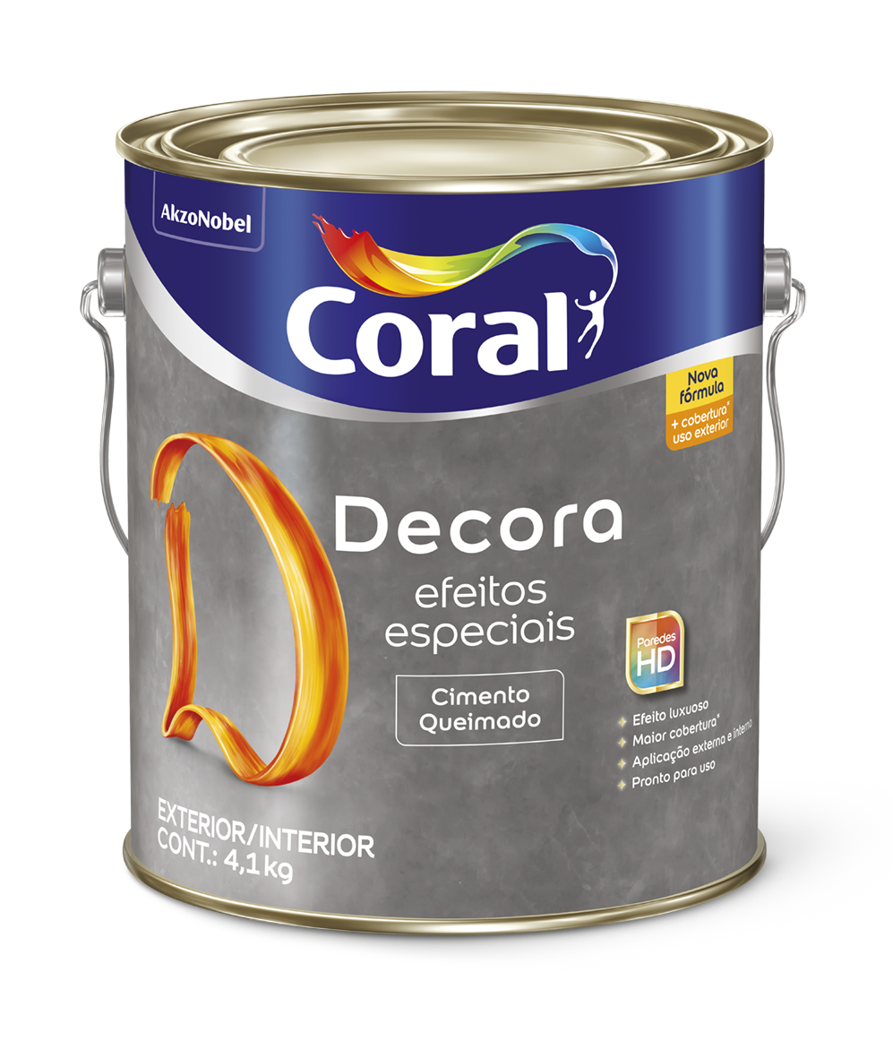 Coral Decora Efeitos Especiais Cimento Queimado foi inspirado na aparência moderna e sofisticada do concreto. Sua nova fórmula possui maior cobertura* e é indicada para área e interna, além de ser fácil de aplicar.