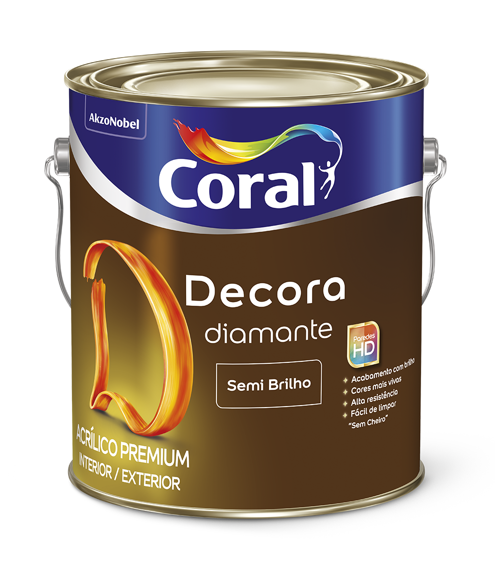 Decora DIAMANTE é um Acrílico Premium Semi brilho de alta resistência e fácil de limpar que conta com a exclusiva tecnologia Paredes HD oferecendo cores mais vivas e um acabamento com brilho.
