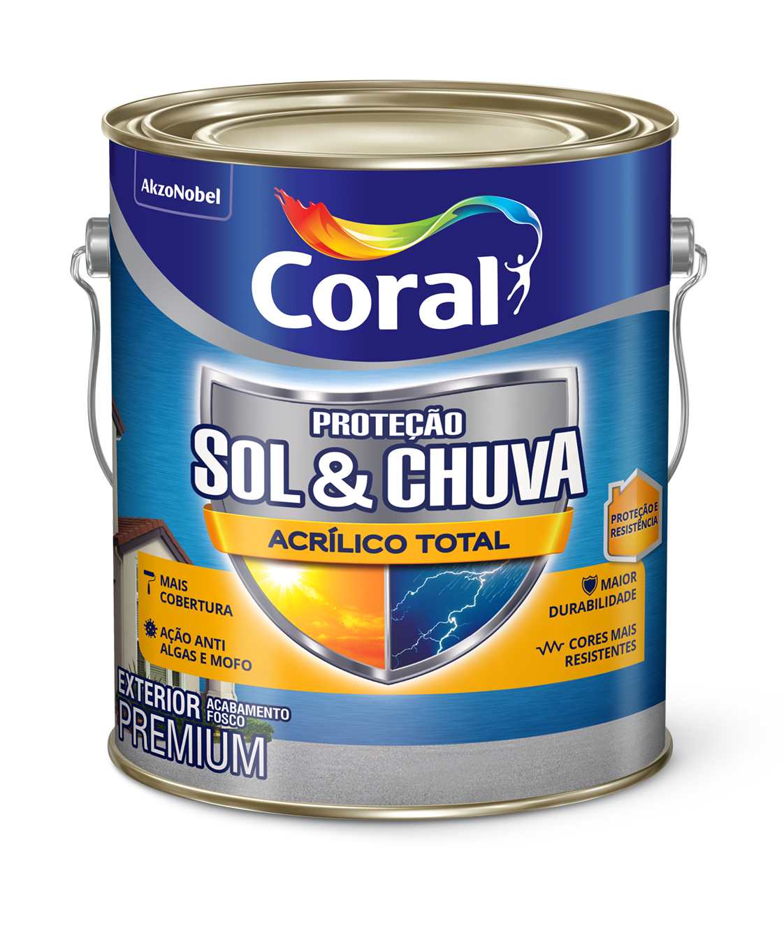 Proteção Sol & Chuva Acrílico Total é uma tinta desenvolvida especialmente para paredes externas, que proporciona elevada proteção e resistência às superfícies, além de entregar mais cobertura, ação anti algas, mofo e durabilidade para suas cores.