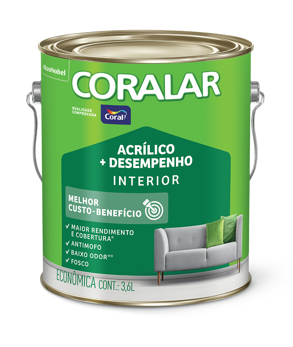CORALAR ACRÍLICO + DESEMPENHO é a tinta econômica que proporciona o melhor custo-benefício, pois possui maior rendimento e cobertura, além de ser antimofo e possuir baixo odor.