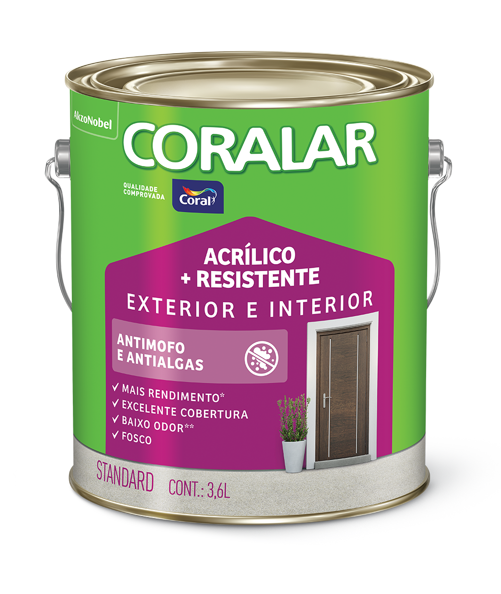 CORALAR ACRÍLICO + RESISTENTE é a tinta STANDARD que oferece dupla proteção para as paredes da sua casa: evita a formação de mofo e de algas.